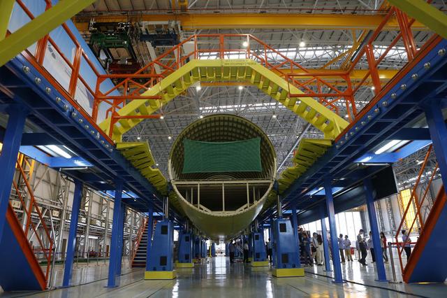 截至2014年8月,C919已獲得400架訂單那C919優(yōu)勢何在?中國商飛上海飛機設計研究院總體氣動設計研究部部長黃煒將C919的優(yōu)勢定義為“安全、舒適、經(jīng)濟和環(huán)?!?,減阻5%、減排50%、減重2%,發(fā)動機比現(xiàn)在正在運營的同等座級的機型降低燃油消耗12%-15%。圖為C919大型客機開始結(jié)構(gòu)總裝。